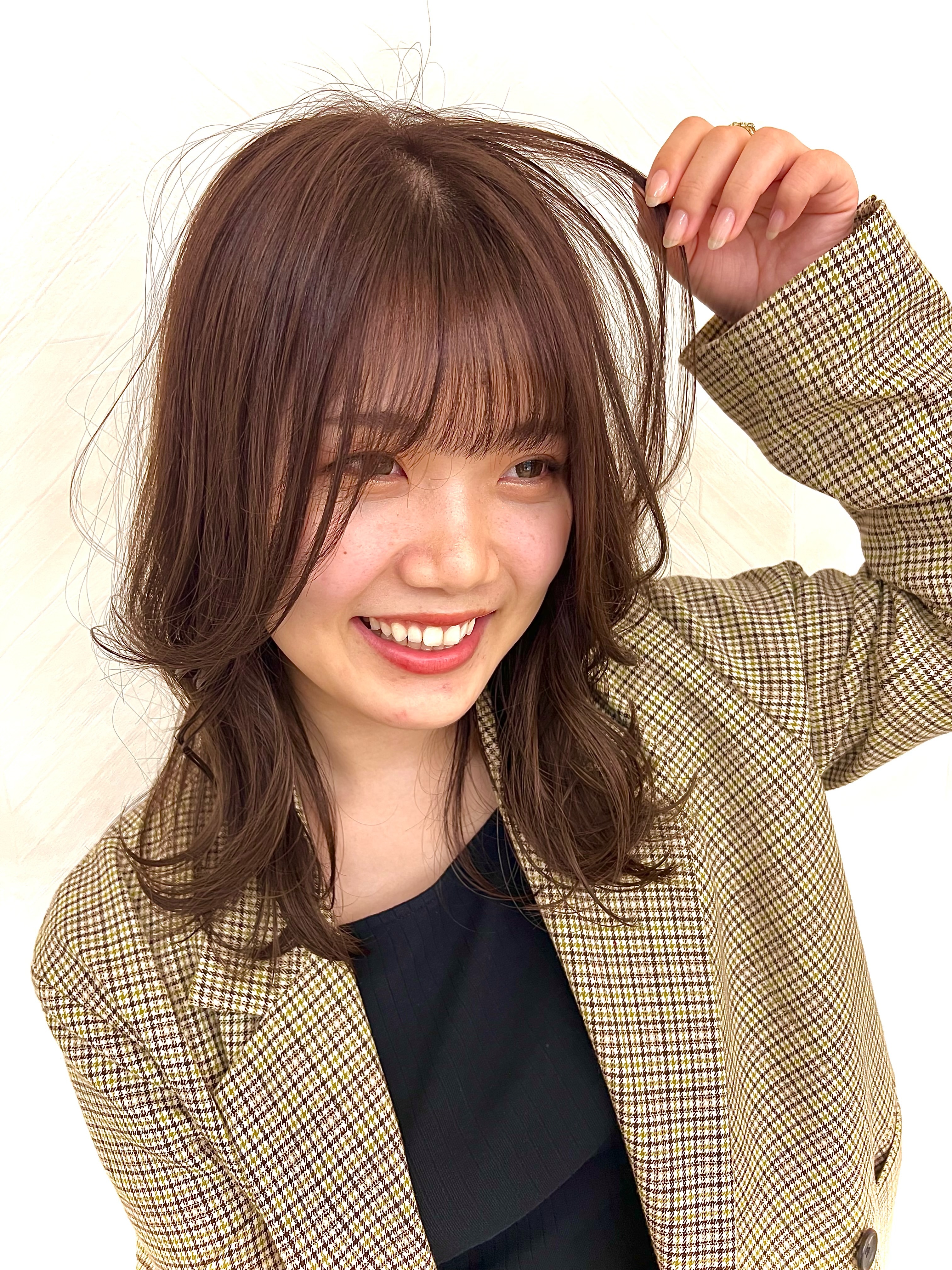 顔まわりにレイヤーをいれて、つやのあるショコラブラウンです!