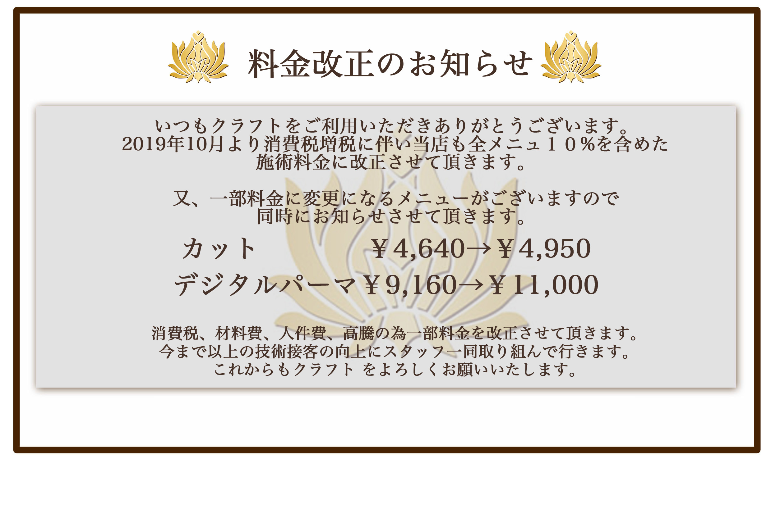消費税とメニュー変更による価格改正のお知らせ。